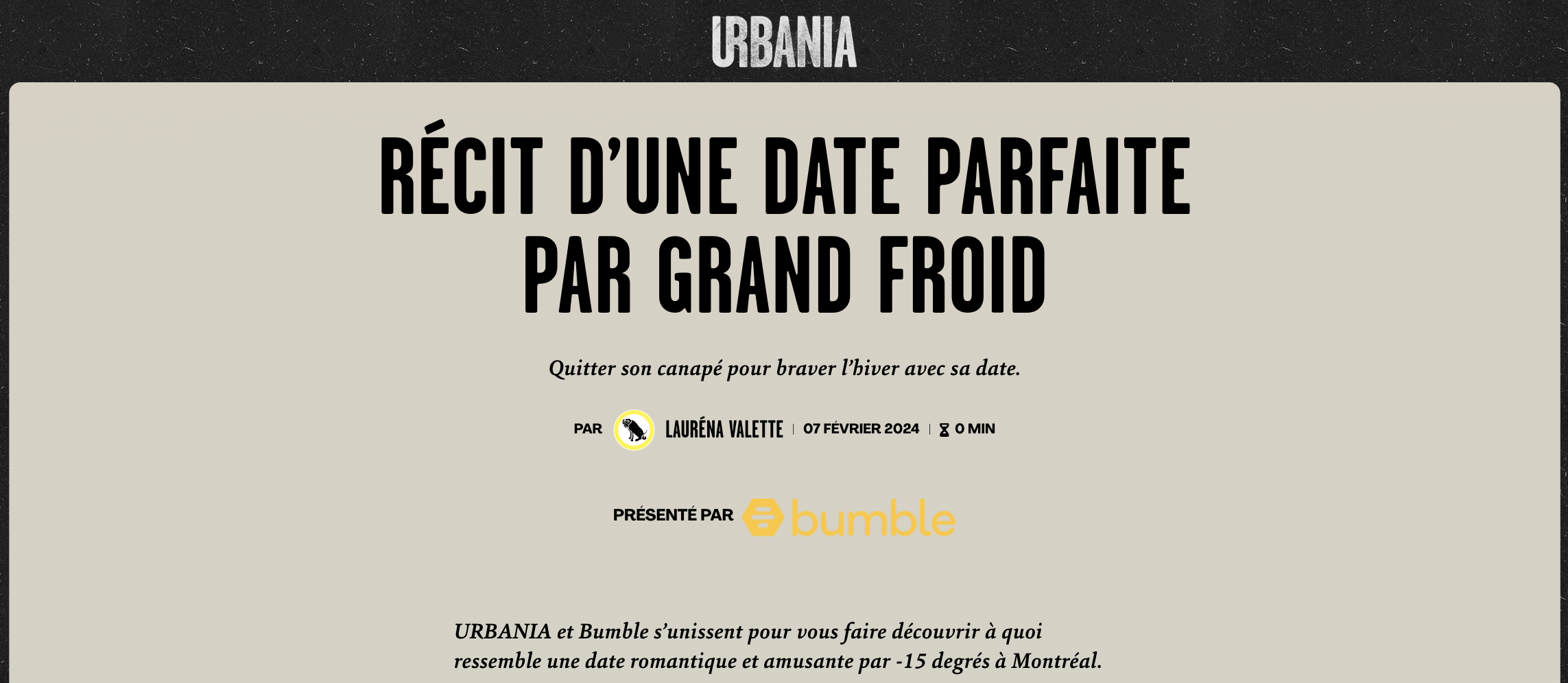 J’ai collaboré avec Urbania Media et Bumble pour la rédaction d’un reportage autour d’un rendez-vous amoureux en plein hiver à Montréal. En plus d’écrire le texte, j’ai été responsable de la recherche en amont : de l’organisation des activités au choix des lieux, jusqu’à la sélection du couple qui s’était rencontré sur Bumble. Un projet mêlant storytelling, mise en scène et regard journalistique sur les rencontres en ligne.